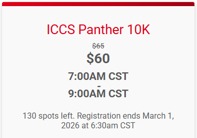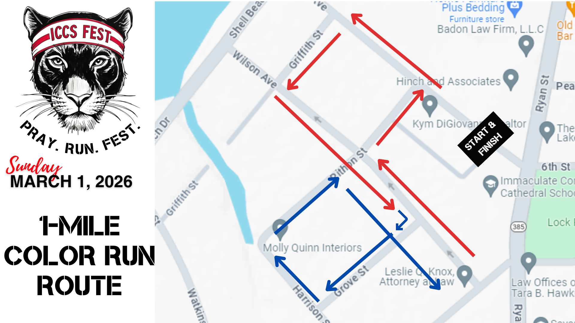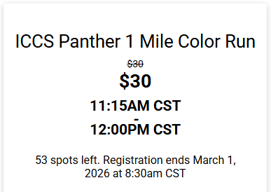 ICCS PTO will be holding its annual Panther Run/Walk 10k, 5K, and 1-Mile Color Run on Sunday, March 1, 2026. The races and color run will wind through the streets of the beautiful Margaret Place District and along Shell Beach Dr. Please join us and support ICCS whether you run, walk or cheer! Proceeds from this event go to benefit the faculty, staff, and children of ICCS.
